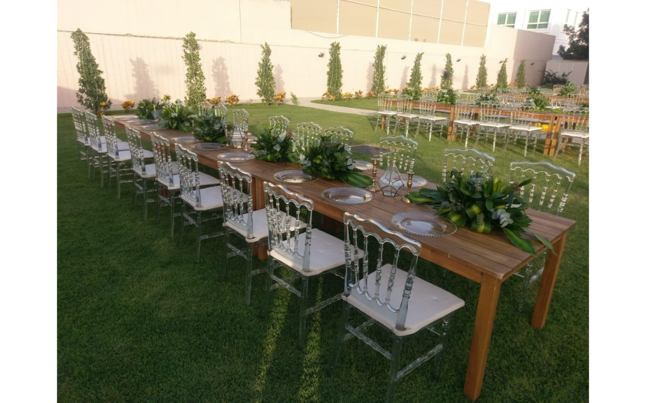 The Acrylic Chair and Wooden Table offer a chic combination of contemporary design and classic charm, perfect for exhibitions, gala events, private parties, and cocktail gatherings. The sleek acrylic chairs provide stylish comfort, while the warm wooden table adds sophistication.