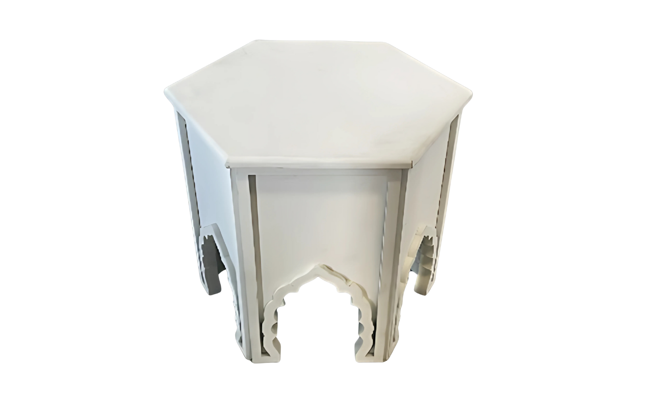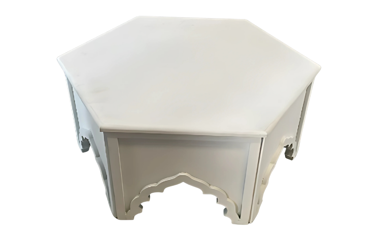 This elegant White Arabic Table features a unique hexagonal design with intricate arch cutwork, adding a traditional Middle Eastern charm to any setup. Its versatile design makes it suitable as a coffee table, cocktail table, or centre table, enhancing both classic and modern event décor themes.