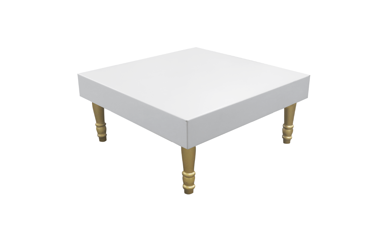 The Avalon Gold Square Coffee Table can be rented. This table top has a white smooth finish with a semi-gloss finish and detachable metallic gold wooden legs. This table is ideal for a variety of uses, including exhibitions, VIP functions, event set-up, conferences, and more.