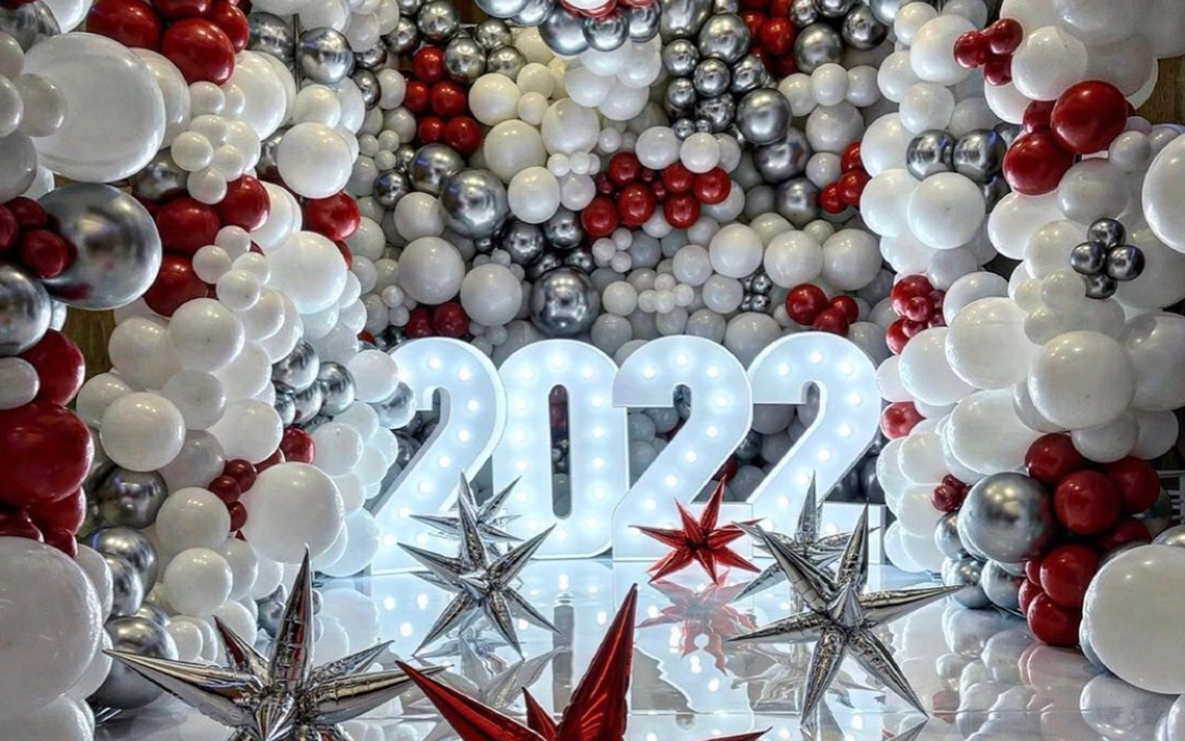 This is a Balloon covered square backdrop with balloon pillars and Star foil balloons. The Backdrop message is "2022" in small LED Lights. The prime colors of the decor are White, Silver, and Chrome Red.