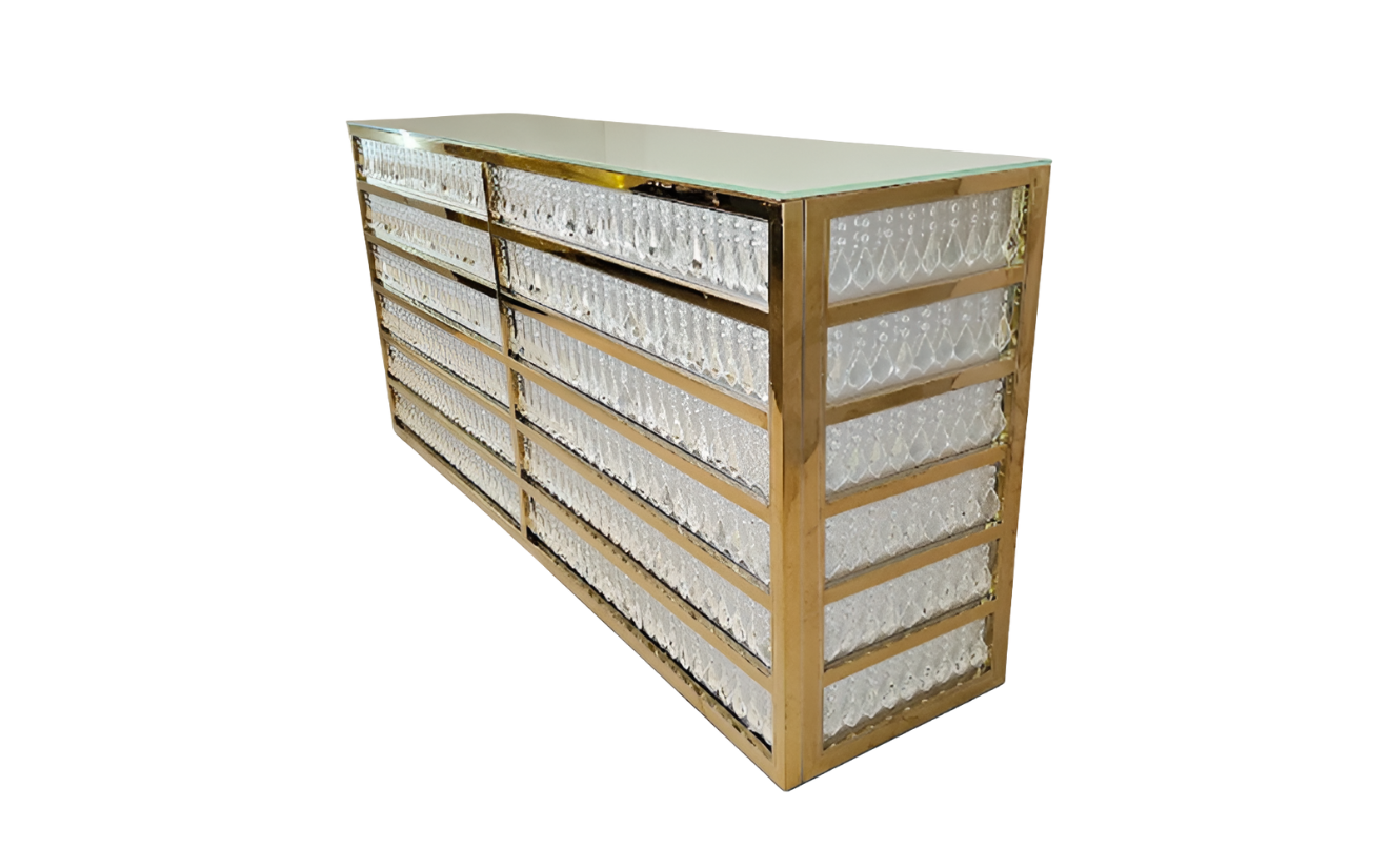 A luxurious bar counter featuring a shimmering design with a golden frame and reflective accents, adding a glamorous touch to any celebration. Perfect for high-end parties and corporate events.