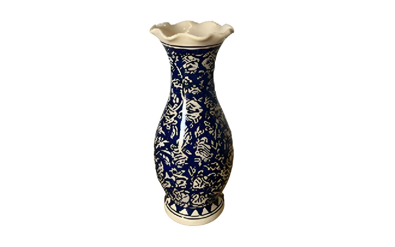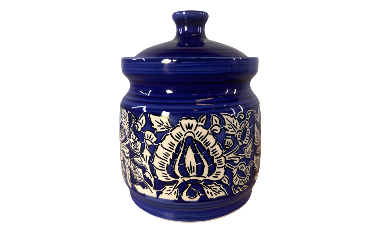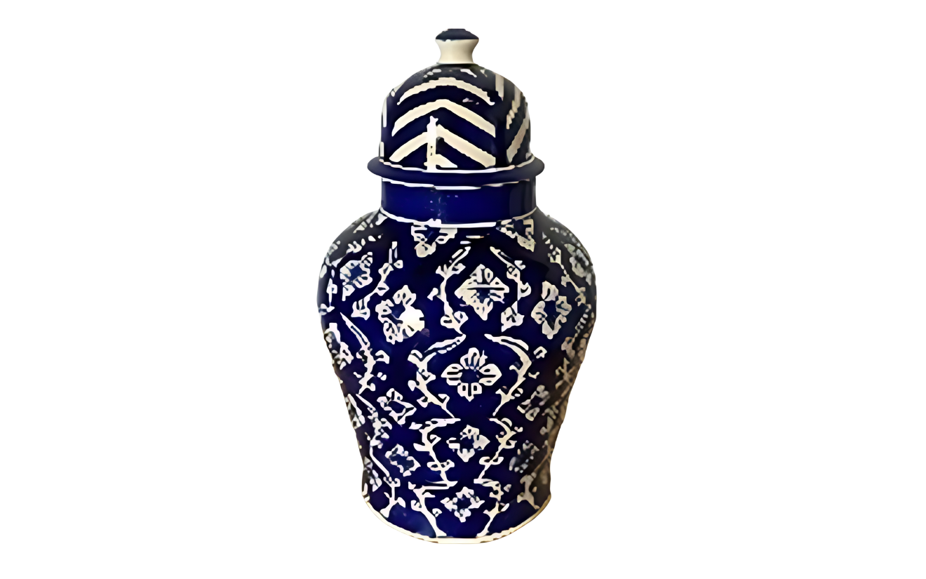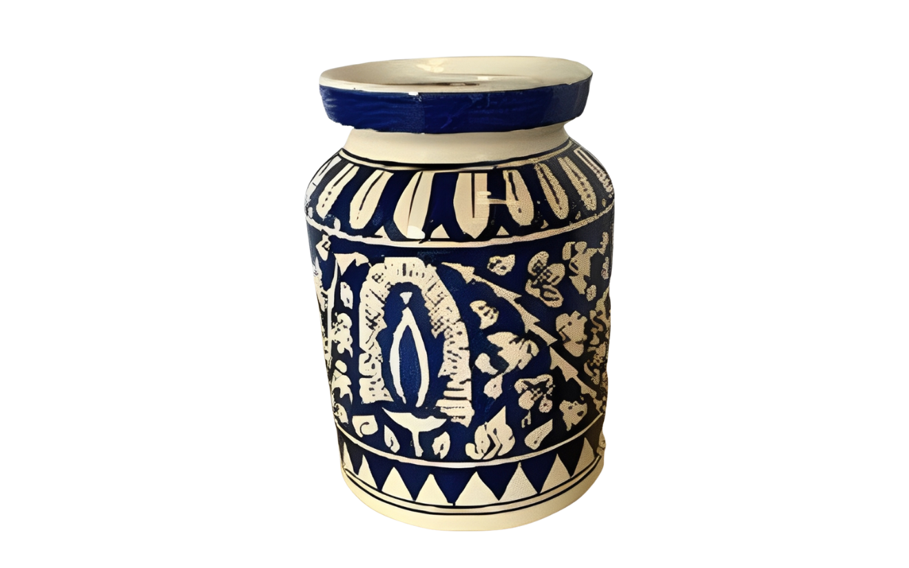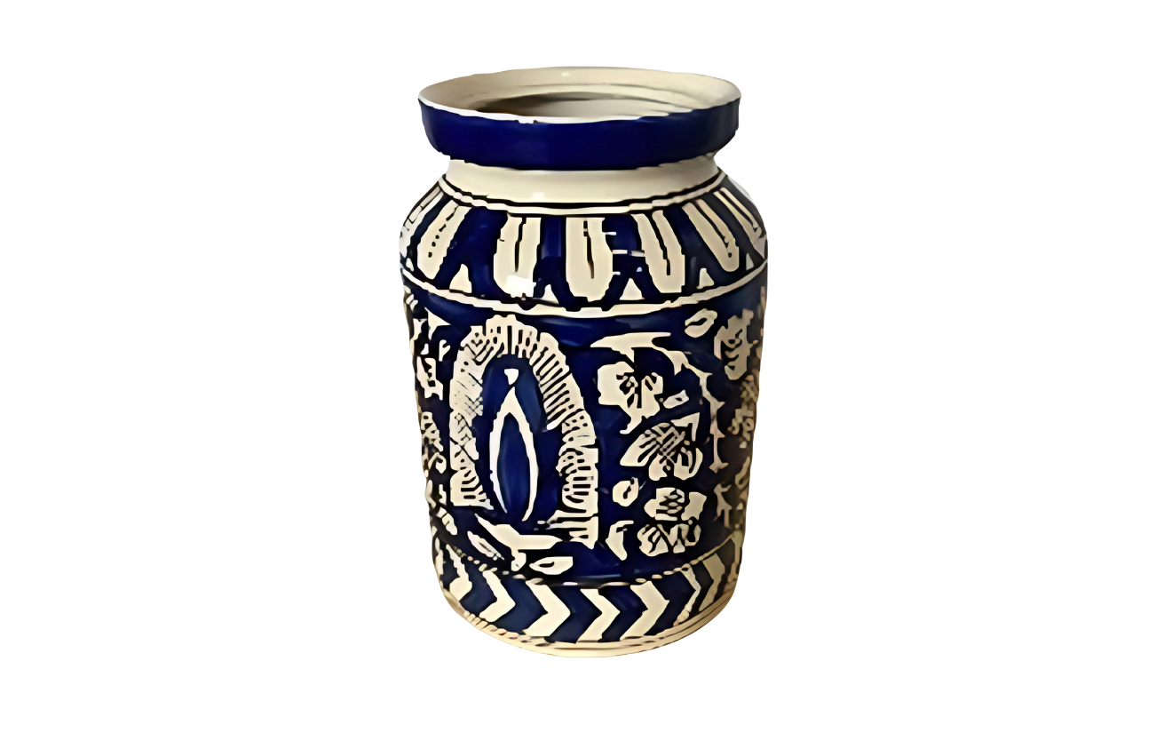 Elegant handcrafted blue pottery vase/jar with traditional floral patterns, perfect for enhancing décor setups. Its artistic detailing and glossy finish add a touch of sophistication to any event or display.