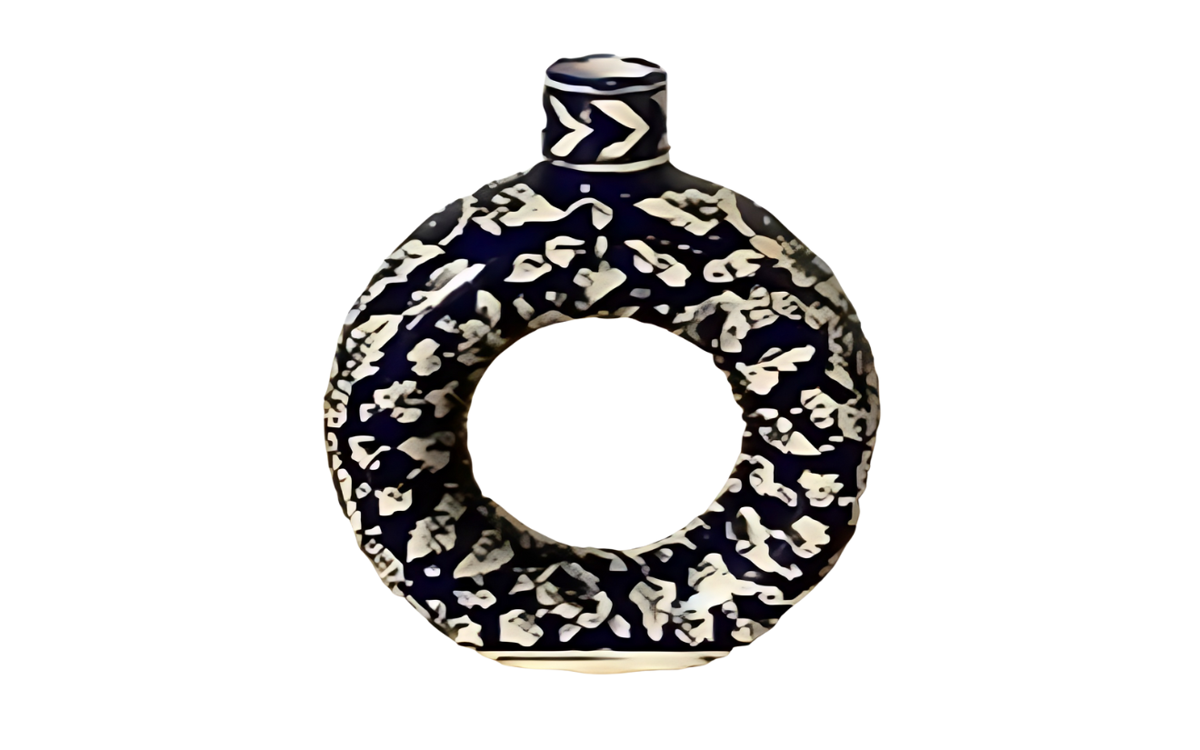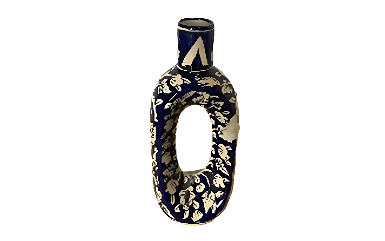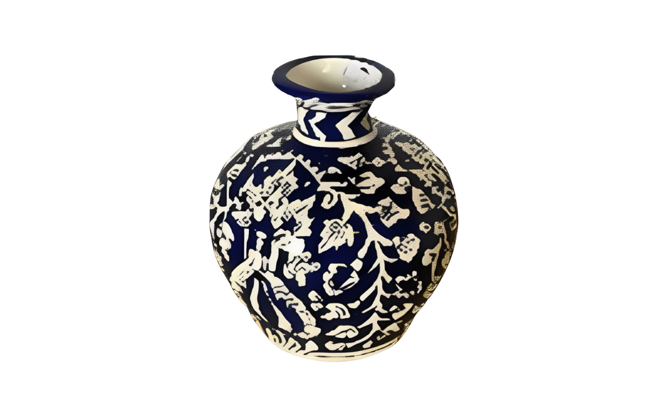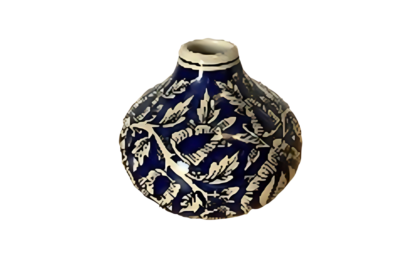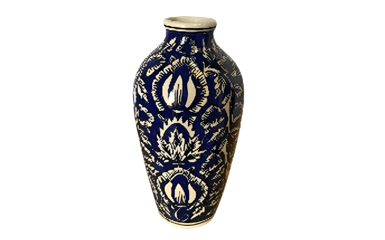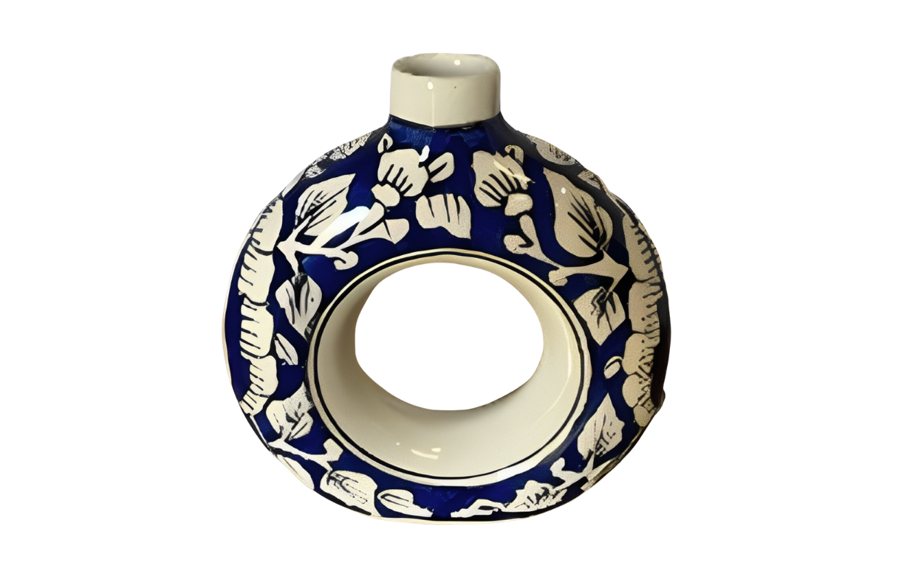 Elegant handcrafted blue pottery vase/jar with traditional floral patterns, perfect for enhancing décor setups. Its artistic detailing and glossy finish add a touch of sophistication to any event or display.