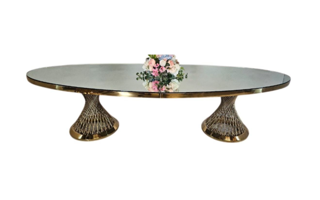 The Bridget Oval Table combines a sleek glass top with a stylish gold metal base, creating a modern yet elegant centerpiece for dining or event setups. Its oval shape adds sophistication while maximizing seating space.