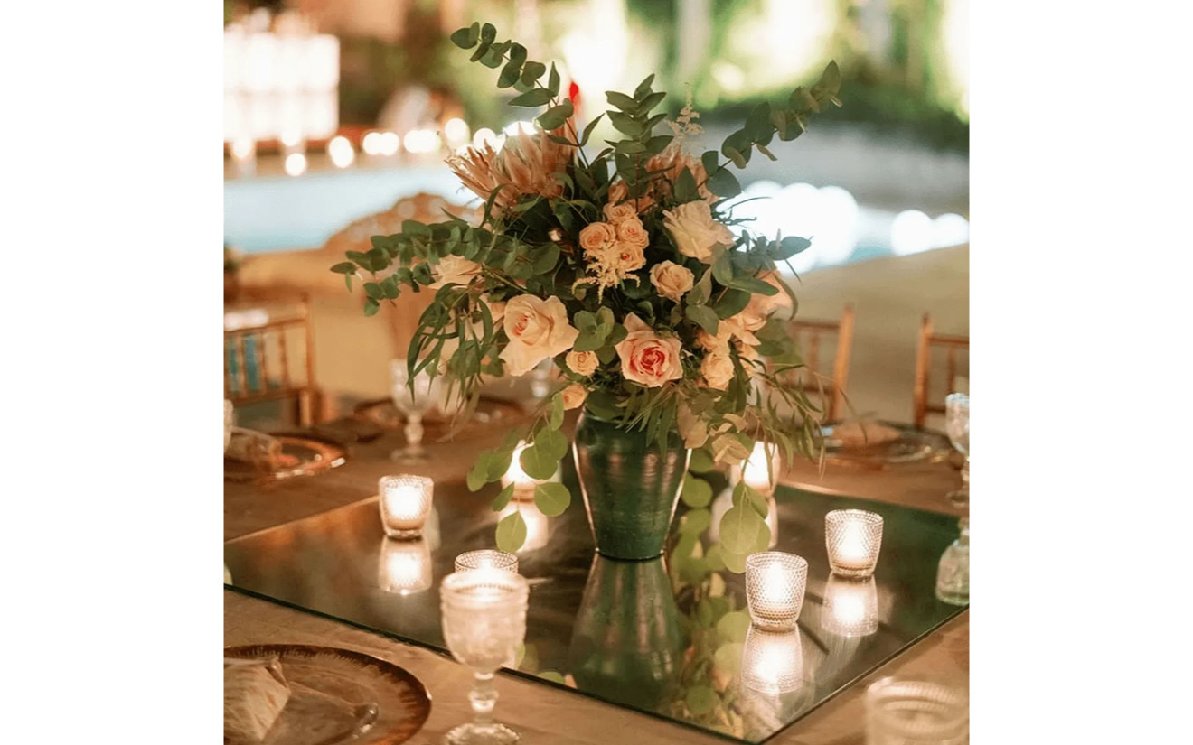 Our large square mirrors can create a beautiful reflection of your centrepiece arrangements and add a touch of elegance and glamour to your event decor. If you're using candles, the mirror's reflection can double the illumination, creating a romantic and enchanting atmosphere.