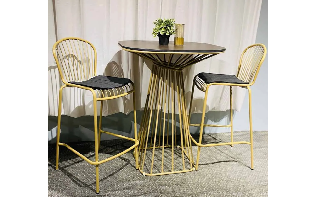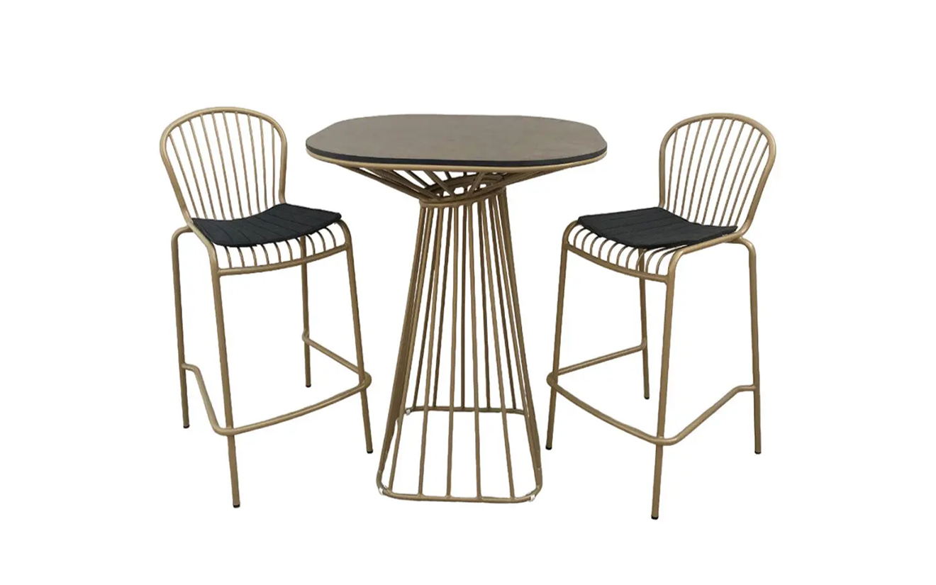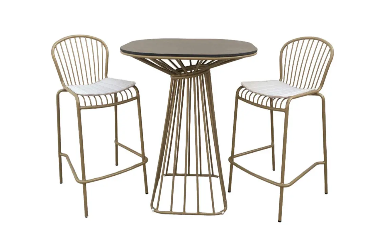 Slim but curvy….the Corset range is a real head turner! Made of matte champagne gold metal wire, these complementary chairs and tables are in enviable shape. So now, so hot. The champagne gold Corset collection includes stools and cocktail tables. The tables come with a brown marble-like finish top.