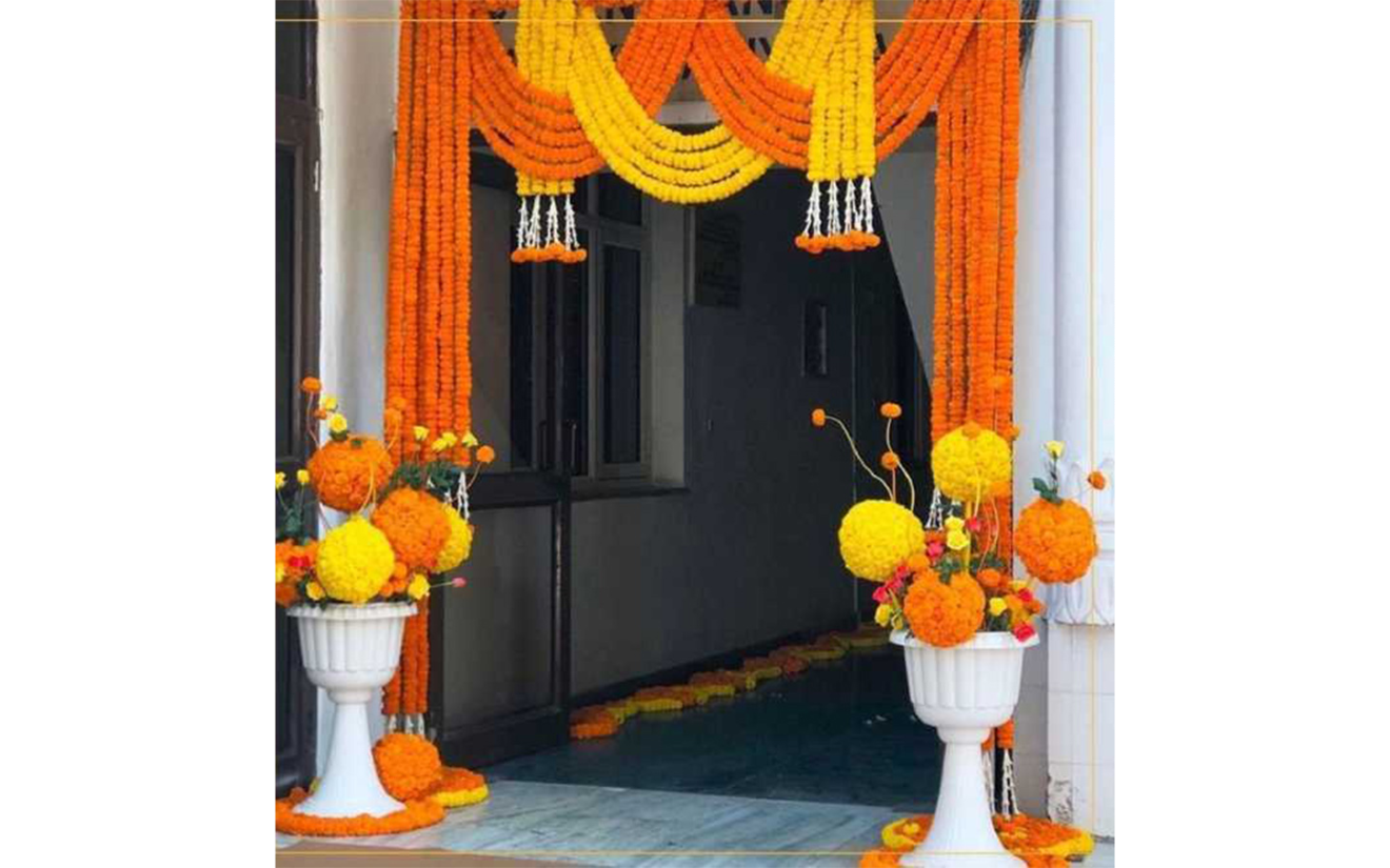 With Diwali Marigold Entrance Decor, create a welcoming and vibrant entrance. Marigold blossoms, the traditional floral motif for all Indian celebrations, are the focal point of this décor. Your decor will become more vibrant and youthful with this theme.