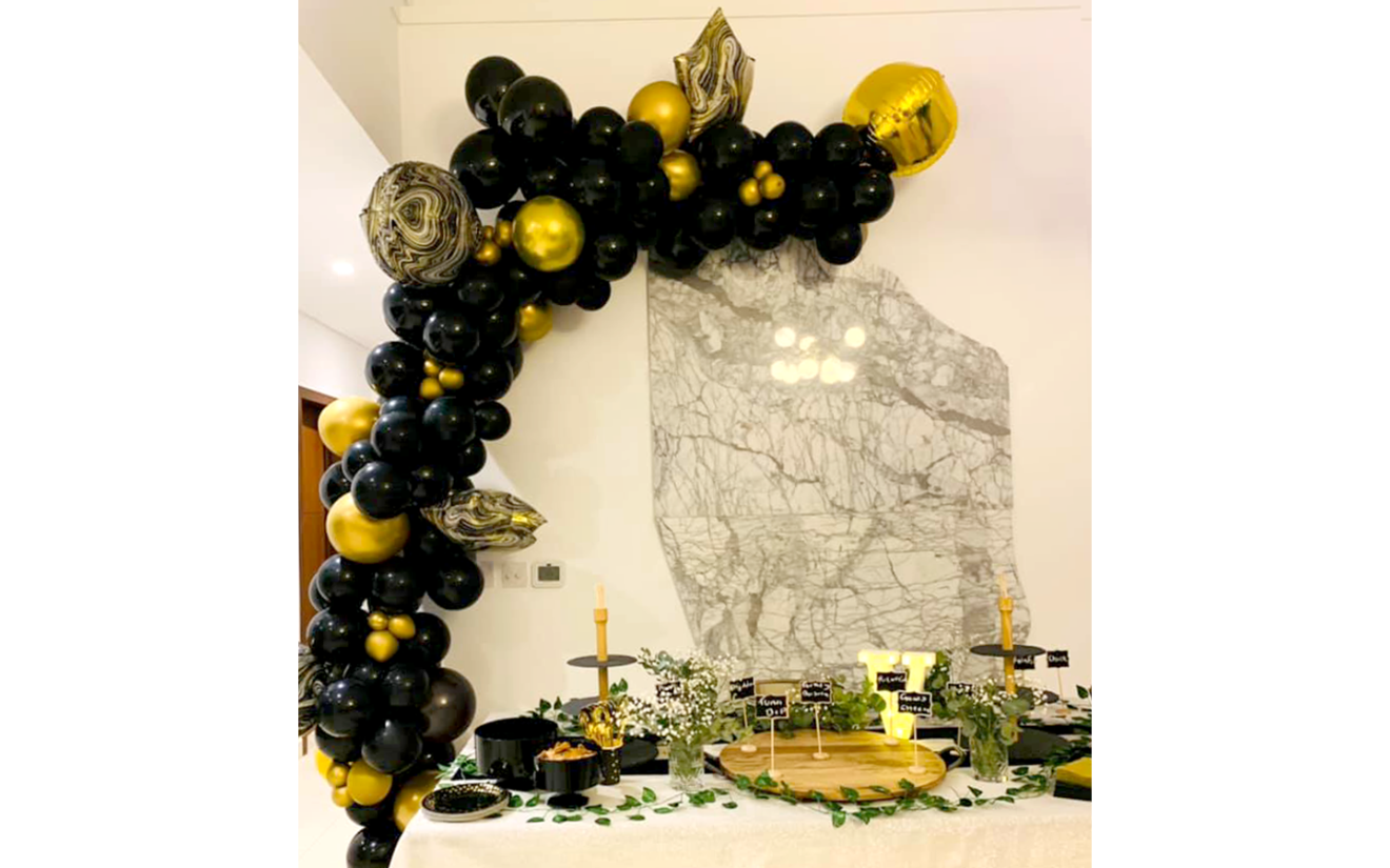Half Balloon Arch is available for hire. An arch composed of balloon garland and decorated with foil balloons is part of the décor.
