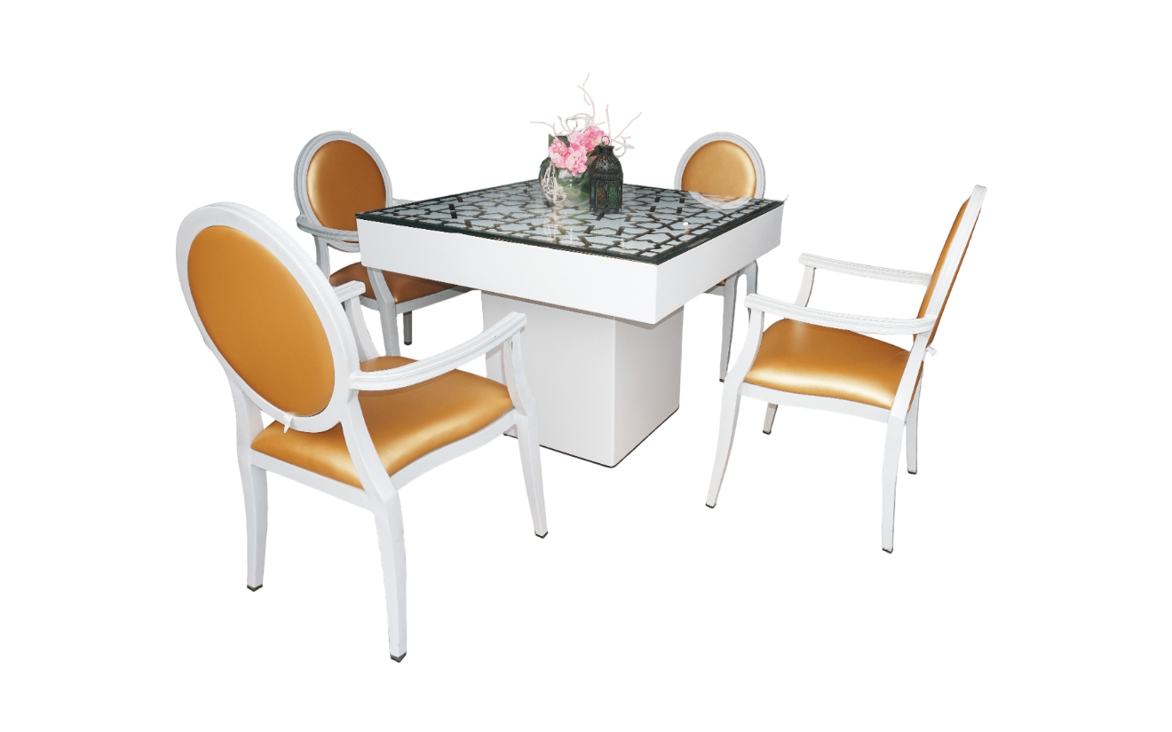 Le Minou Square Dining Table with Mashrabiya Table Top is available for rent in Dubai, Abu Dhabi and UAE. This table is perfect for Exhibition, Weddings, Event Set-up, Indoor and Outdoor Set-up. Contact us now to order the Mashrabiya Dining Table or for any other event furniture need.