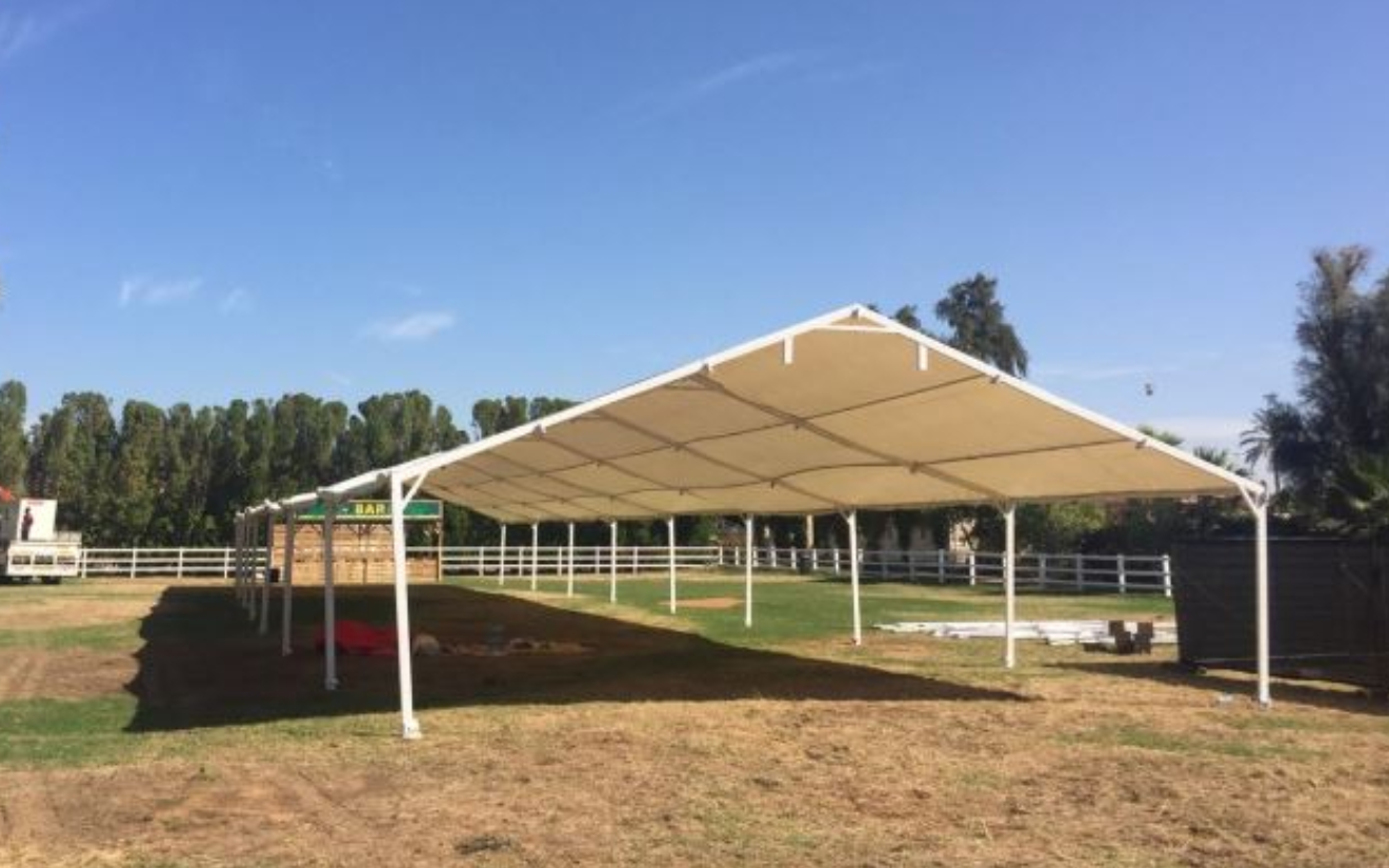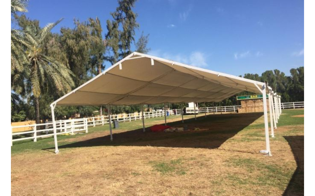 Metal Structure PVC Tent 10m x 30m is available for hire through Hafla. The tent's metal construction and PVC material make it durable enough to resist a variety of weather conditions.
