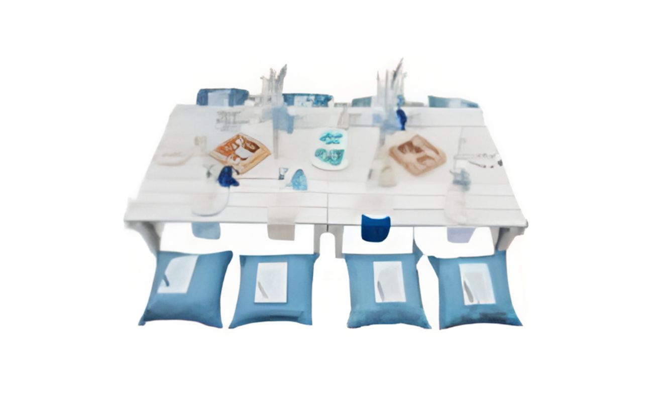 - 6 Floor cushions (blue with white accents)