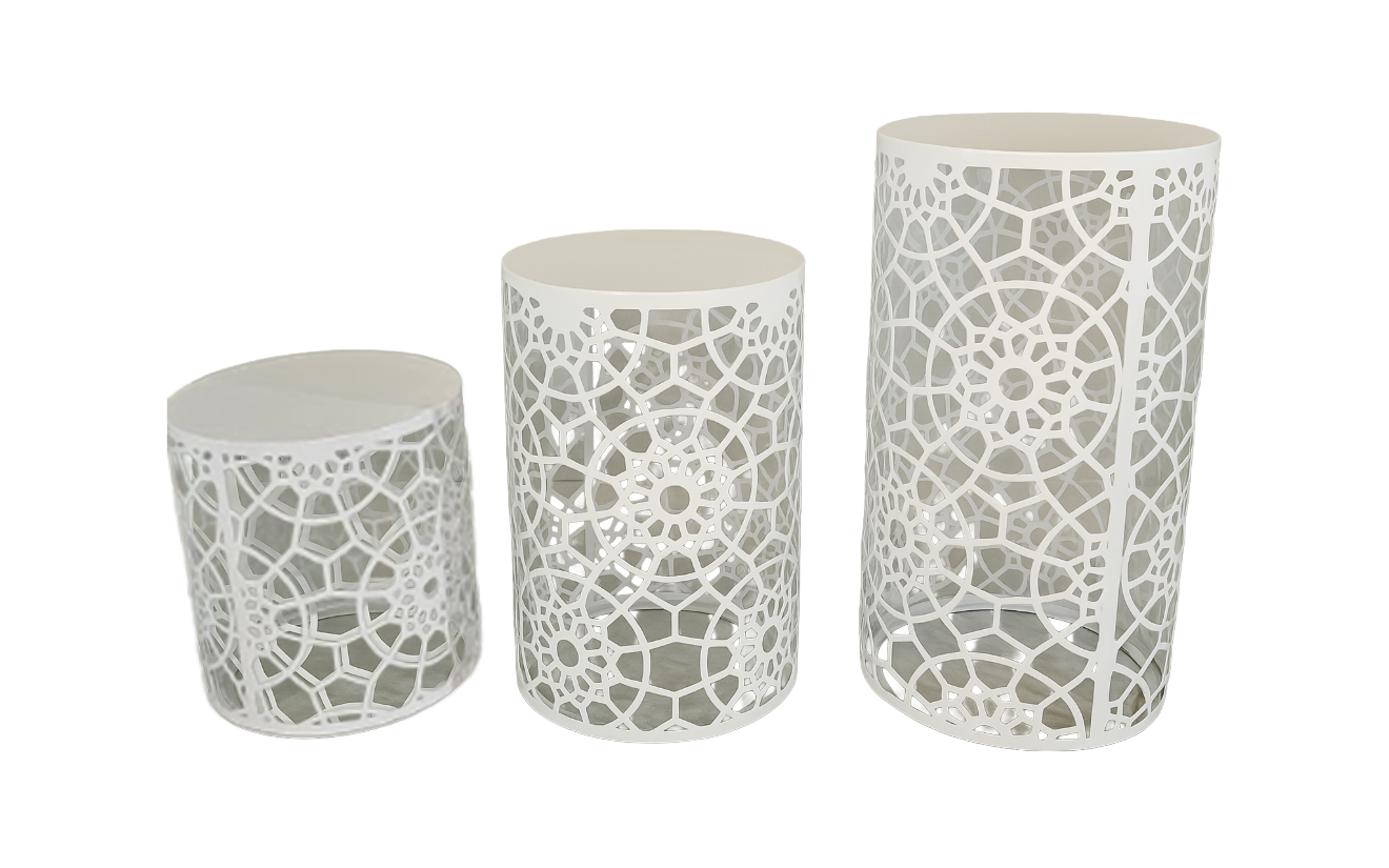 Enhance your event décor with this elegant set of 3 pedestals in assorted sizes. Perfect for displaying cakes, floral arrangements, props, or decorative accents, these pedestals add height and sophistication to any setup. Their versatile design makes them suitable for weddings, parties, and themed events.
