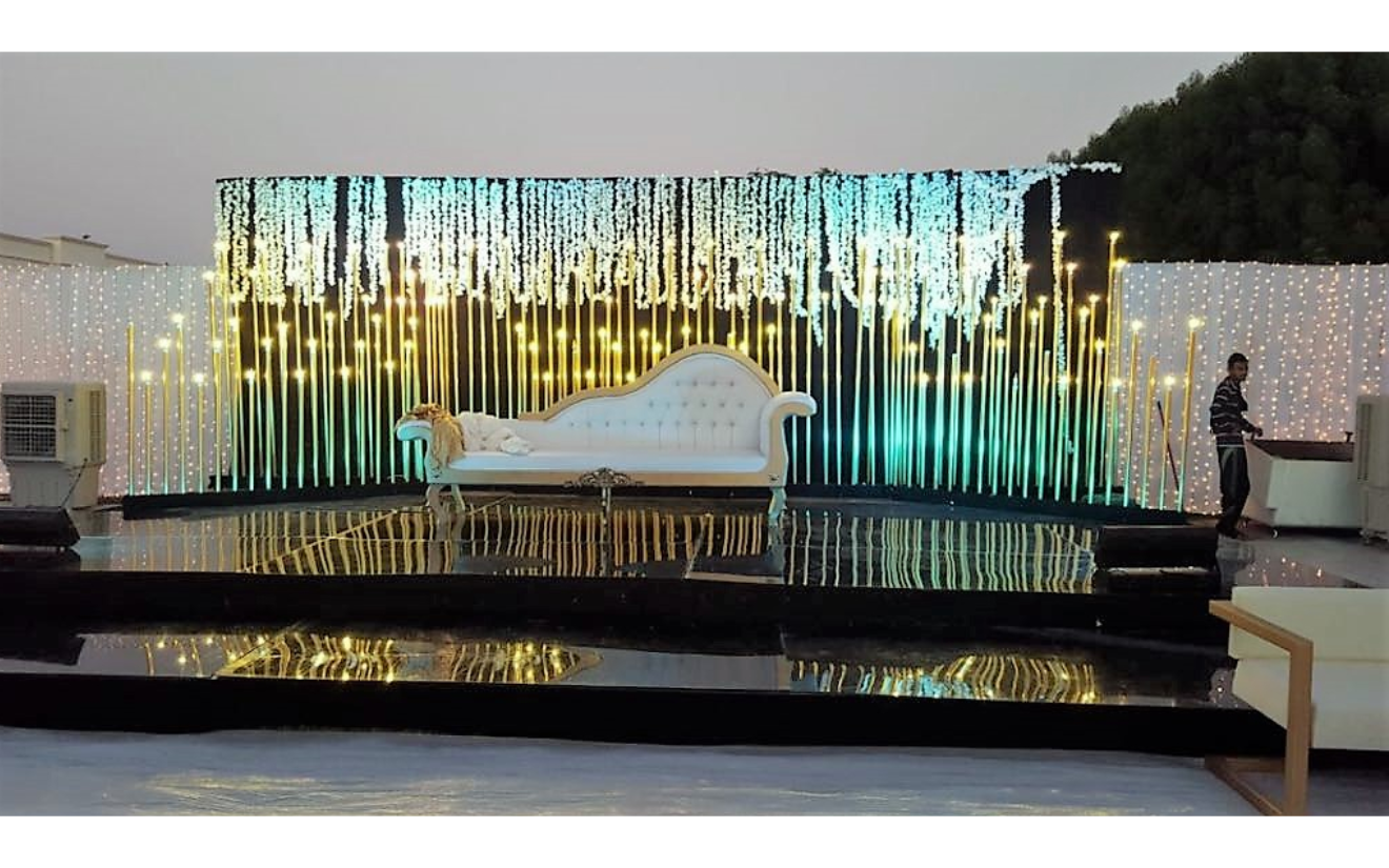 Wedding Decor | Sofa | Acrylic Flooring | Lights | Carpet | Flower Stands