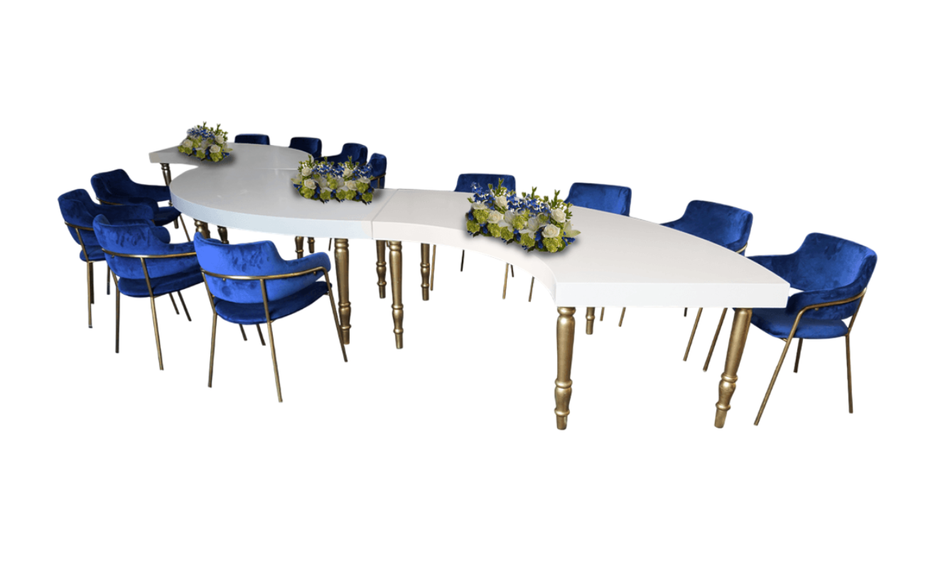 The Quarter Moon Dining Table can be transformed into a Half Moon Table, a C Table, or a Donut Table, making it extremely adaptable. Weddings, VIP parties, and gala dinners are all possible with this design. Rentals are available.