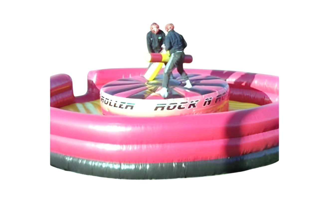 Rock n Roll Gladiator Joust Inflatable. Are you ready for the ultimate battle! This is a great variation of the more traditional Gladiator Duel. Both players stand on the same huge inflated Podium! The podium can tilt in any direction depending on the players movement, so balance and movement are just as important as your jousting skills. It inflatable would makes a great centre piece attraction for your fun day. Available on rental and enjoy pleasant time with friends and family!