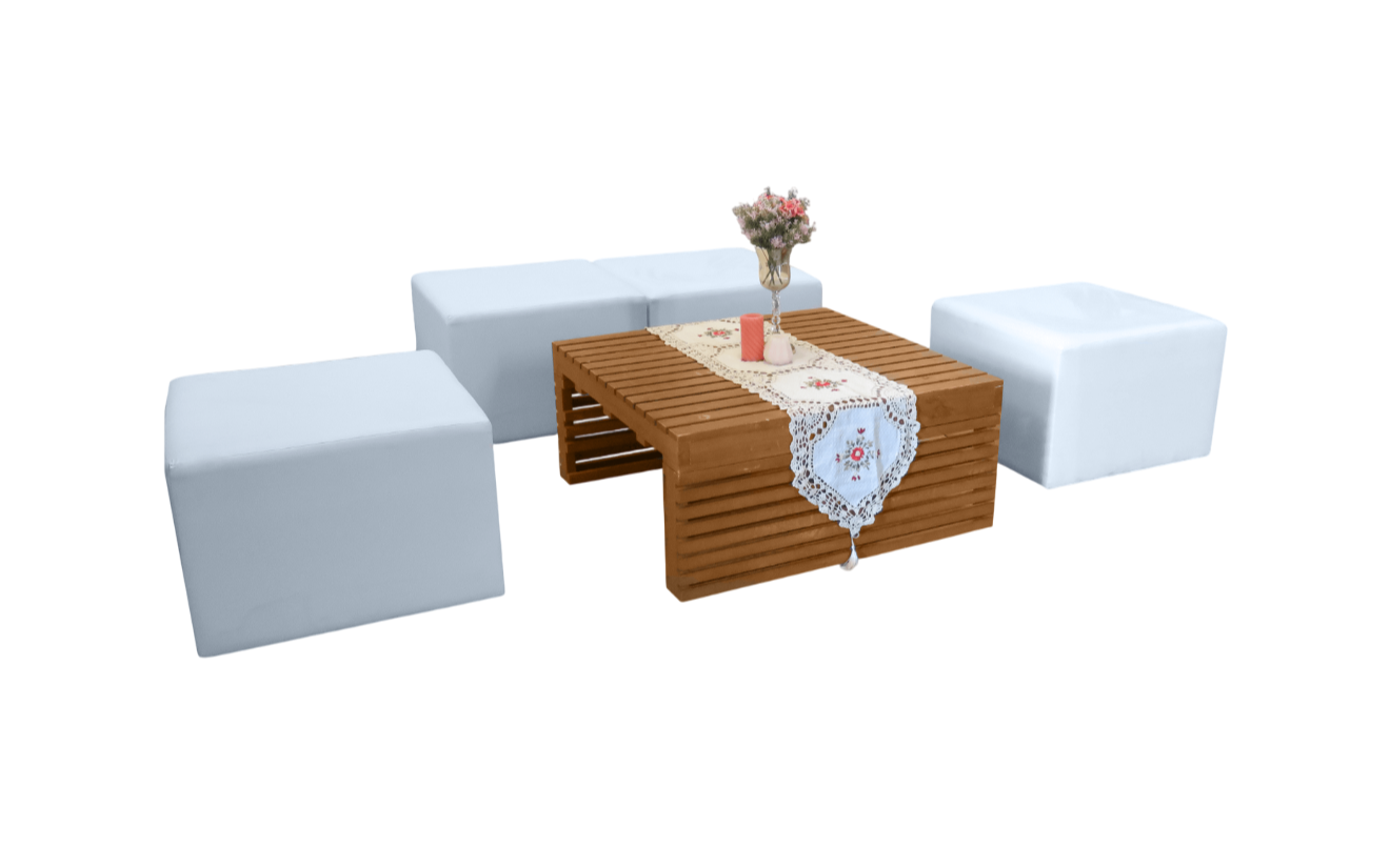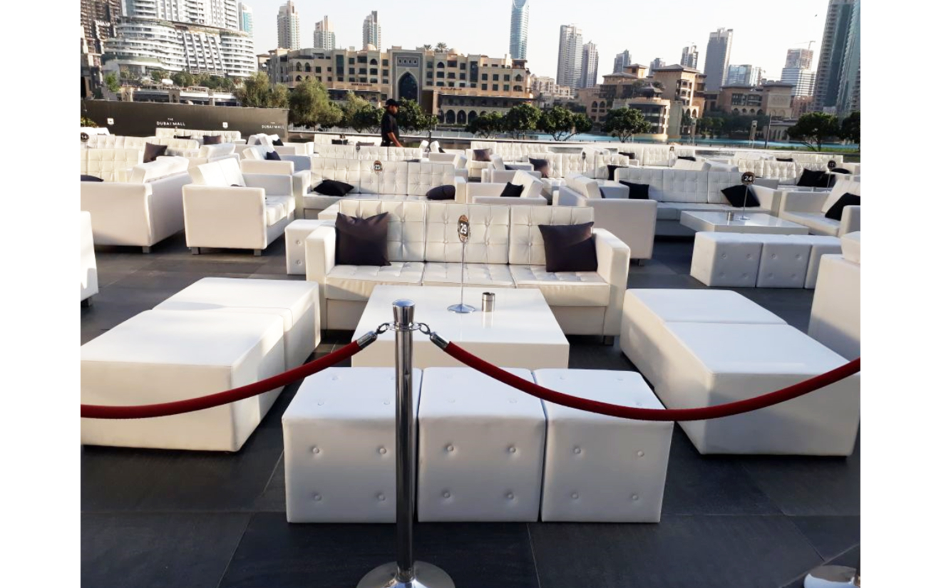 The white Roma Majeure Pouffe is available for hiring at Hafla. This leather-upholstered pouffe is ideal for weddings, galas, VIP functions, event set-ups, conferences, and more.