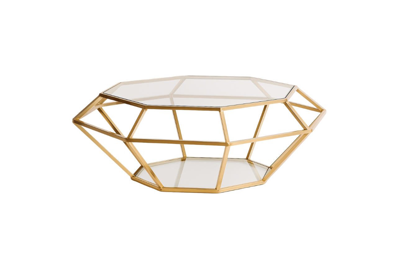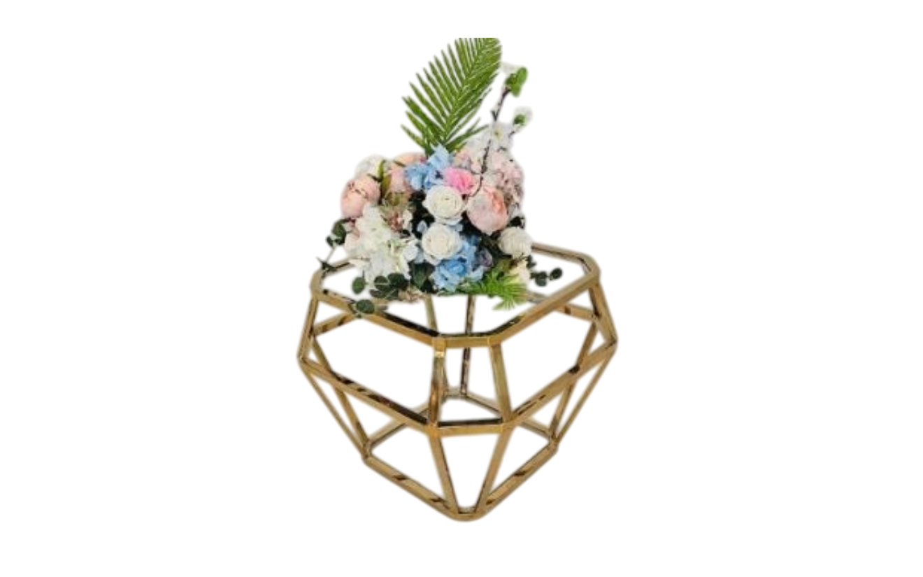 The Ruby Coffee Table is a stunning centerpiece with its geometric golden base and sleek glass top. Its bold, modern design adds elegance and functionality to any lounge or event setup. Perfect for serving or as a décor highlight, this table radiates luxury.