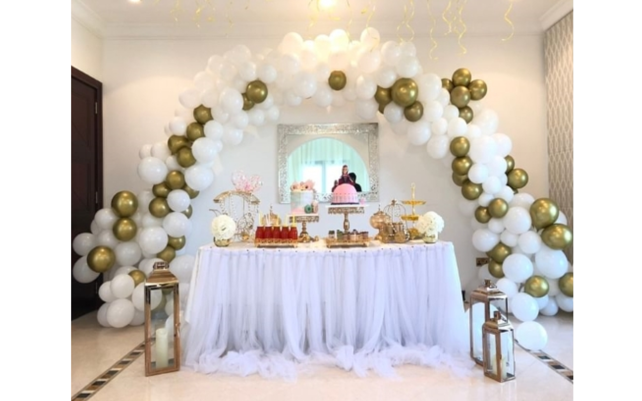 This opulent and exquisite white and gold theme design is a beautiful decoration that will undoubtedly enhance the ambiance with its presence. This theme's decorations include balloon arches, balloon bouquets, and much more.