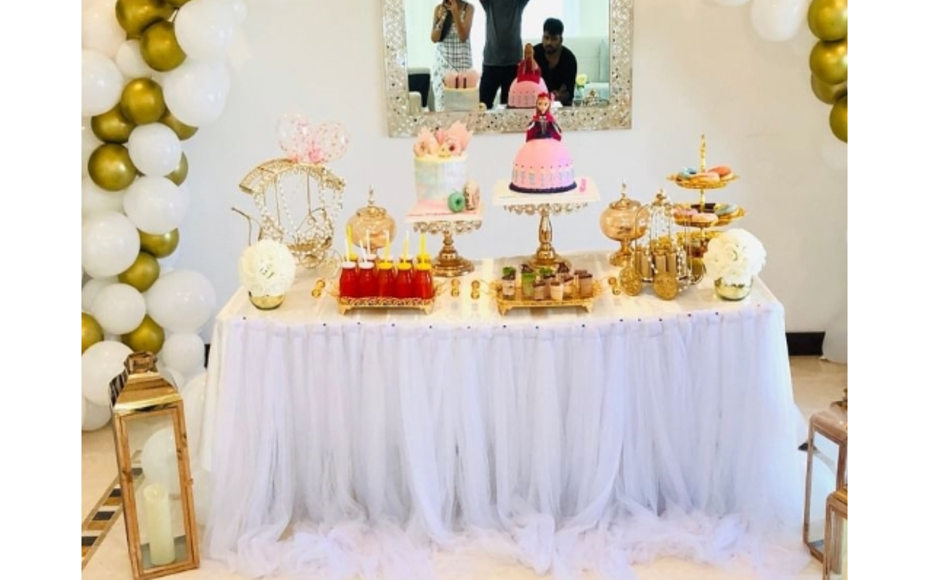 - Exclusive Cake Table Set-up With Cake Stand, Cup Cake stand؍ Candy Jars؍ Flower Vase & Golden Trays