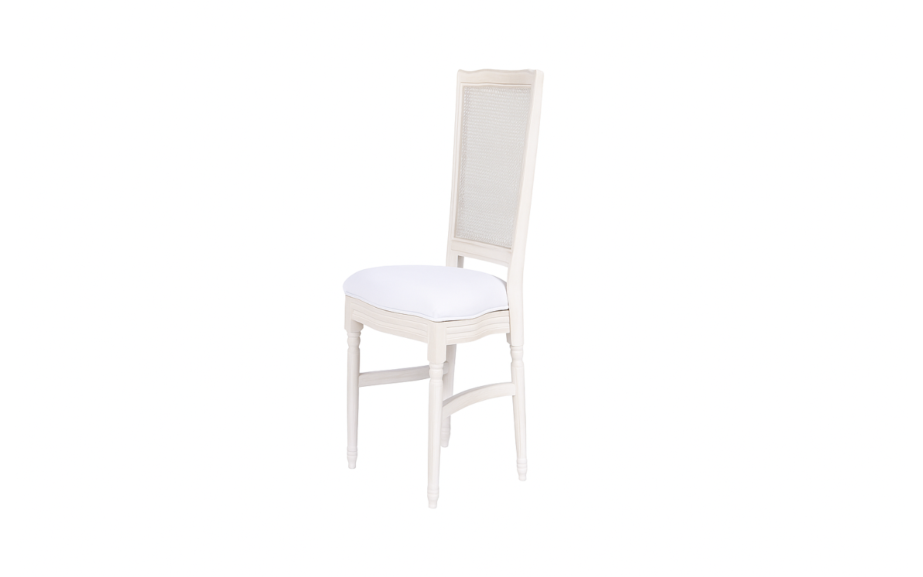 A stylish and elegant White Rattan Chair designed with a classic wooden frame and woven rattan backrest. Its cushioned seat provides comfort, while the refined finish makes it perfect for weddings, parties, and formal gatherings. A versatile seating option that blends charm and durability for any event setup.