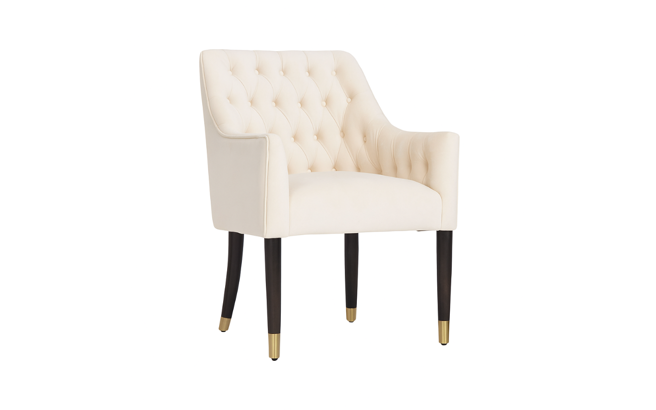 The Winger Chair combines comfort and elegance with its plush upholstery and tufted backrest. Designed with sleek black legs accented with gold tips, it brings a touch of sophistication to any setting, whether used for dining, lounge, or event seating.